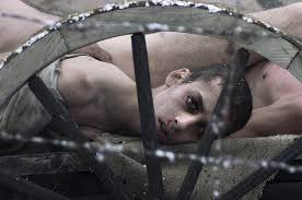 On the image, we see a sad men, wearin old and spoiled clothes, and looking through a fence, with dead people behind.